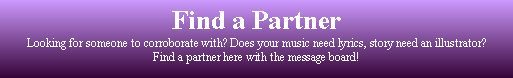Musicians/Bands, Soloists Actors Dancers DJ's Clowns, Jugglers Portrait Artists Singing Telegrams Freaky Talent Shows Web-related Talent Photography Sculpture Music Poetry Paintings Jewelry Design] Graphics Partner Up Privacy Policy Food Contact Us Disclaimer About Us Home