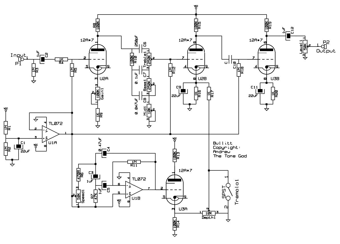 Looking at the schematic for Bullitt (Figure 1) the tube first stage is a simple gain stage. There is a pot on the cathode that will adjust the gain of the stage. The range is quite wide. It will adjust the final output from less the unity, for if you are driving the effect with a boasted effect and you don't want the tremolo to add any distortion, to a significant boast finally to a state when it will mildly distort so it could be used as a light distortion effect.