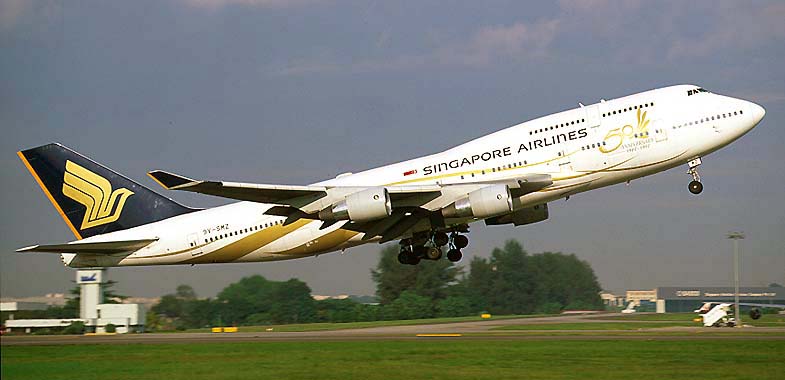In celebrating her Golden (50th) Anniversary in May 1997, Singapore Airlines "gift-wrapped" three aircraft types in gold ribbons. The Megatop fleet was represented by 9V-SMZ, seen here taking off from Changi Airport.