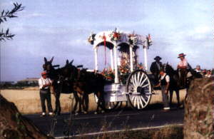 La Hermandad de Niebla hace su salida el jueves anterior al Domingo de Pentecostés, después de la tradicional Misa de Romeros en la Iglesia Parroquial. Termina la larga espera de todo un año; la alegría es generalizada ya que el encuentro de los iliplenses con la Blanca Paloma se aproxima. La Corporación inicia un multitudinario desfile oficial por las calles de la localidad en las que se escucha numerosos ¡Viva la Blanca Paloma! , viviéndose momentos de intensa emoción hasta la salida por el puente romano sobre el río Odiel. Una vez allí se abrigan a la derecha, se guardan las insignias y se toma el camino que lleva a Rociana, la madrina, donde se llega alrededor del mediodía, justo para rezar el Angelus. Tras atravesar Rociana, la Hermandad llega a Almonte y alrededor de las cuatro de la tarde al Hogar del Pastorcito donde se realiza una ofrenda y se almuerza reponiendo así las fuerzas y dando descanso a los animales. Los cantes brotan de las gargantas de los romeros y los pies, incapaces de estar quietos, bailan las numerosas sevillanas que se cantan. La marcha de reanuda por el camino de los Llanos para llegar a la Aldea de noche. |