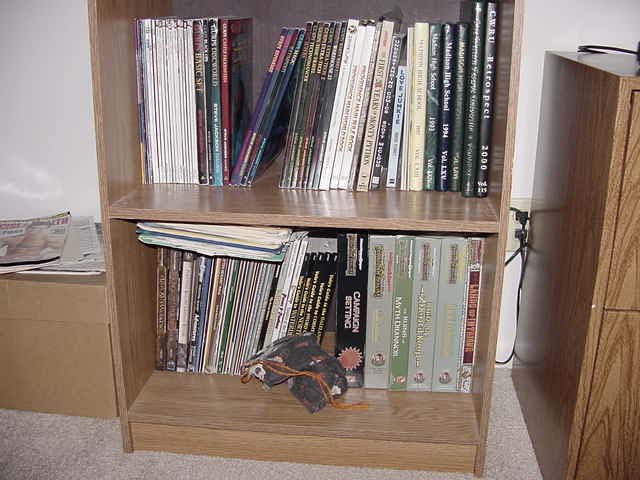 ![]() Off to the right you can see my high school and college yearbooks. The main inhabitants of these shelves are the roleplaying game books, however. A vast majority are either Dungeons and Dragons or GURPS, produced by Steve Jackson Games. I'm hoping to get together a few locals to start playing in a few months....that would somewhat validate all the money I spent on these rulebooks and sourcebooks once upon a time. You'd think that all I do is read, but I still need to show you the other half of the room... |