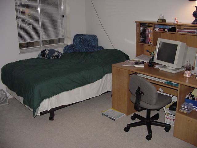 ![]() Here you can see my new furniture, a bed and a computer desk. As you can see the bed puts me level with the window. There's a lot of cushioning and support in there. I have the reading pillow from my parents in the corner so I can sit in bed with a good book. The computer desk is especially nice. This is the first time I have had the kind of room I really need for my computer and all the peripherals and papers I have. I had to put the desk together when I got it. Besides being too heavy for one person to lift, the instruction booklet had 40 pages....the desk was my project for the first weekend in the apartment, needless to say. |