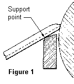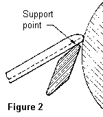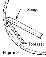 When working on the inside of a bowl with a small diameter, the top bar of the tool rest should either be narrow or slope to follow the arc of the rim, see Figure 3. This may mean that either the rest must be ground to a better shape or one must be specially made.