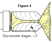 The reason for a short bevel on the gouge now becomes apparent. The shorter the bevel the closer the support will be to the cutting edge, particularly when working inside the bowl. Remember the bevel must be rubbing at all times. If necessary go back to first principles: allow the heel of the bevel to make contact with the wood first and then move the handle until the gouge is just cutting. Needless to say, very light cuts are taken. In turning the inside of the bowl of these goblets I always cut from the outside to the centre. Theoretically this is wrong because the cut will be made against the grain; but this is not a problem if the grain does not tear. In my experience it never does. The difficulty of turning the natural edge thin is compounded by the fact that because it is irregular it is difficult to see. It may help to set up a tungsten lamp behind the bed and a little above the axis of the lathe. This is manoeuvered until its light catches the extreme edge of the bowl. It also helps to position the head so that one eye is looking down the inside surface of the bowl; the tip of the gouge can then be aligned in relation to that surface. How thin one goes, or can go, is determined by a number of factors, eg the condition of the bark, the nature of the wood, the degree of irregularity of the edge, and how brave one is feeling. For ash, for example, 1/16 inch thick is often possible, holly can be made thinner still. The inside of the bowlOnce the rim has been dealt with the rest of the inside of the bowl is reasonably straightforward. To help prevent too much wood being taken out (ie cutting through the bowl) it helps to place the lamp behind it so that the light shines through the bowl from the outside. Note, however, that this can be misleading where there are marked colour changes in the wood, such as differences between heartwood and sapwood in cherry or yew. Because it is necessary to work down the bowl in stages it is not possible to take long sweeping cuts as one would on a large bowl. Also, the gouge will tend to dip into the spaces when turning the irregular edge. For both these reasons some ridges may be left which cannot be eliminated with the gouge. Then a special technique is used. This is a variation on Dell Stubb's method of shear scraping. A ½ inch scraper, with a sharp burr on it, is held pointing well downwards, perhaps as much as 45° with the burred edge at an angle to direction in which the wood is moving. The scraper is held not on the rest, but on the fingers (which can be supported by the rest). The tool is pulled across the work, from the centre to the rim, parallel to the top of the rest. This is not dangerous because, at the angle the scraper is held, there is no possibility of a dig-in. When making these goblets I use a relatively slow speed. This means that when performing this technique of shear scraping the tool will follow the work even if it has already begun to distort and has gone out of round. Using this method on end grain it is possible to get a very good surface which needs very little sanding. The outside of the bowl and the stemHaving finished the inside of the bowl attention is now turned to the outside and to the stem of the goblet. First, the lamp is moved so that it shines through from the inside of the bowl and the remaining waste wood on the outside of the bowl is removed whilst gradually cutting towards the top of the stem. Probably, it will be found that, because of movement of the wood, there is an obvious transition from the new cuts and those made earlier. Before getting quite to the top of the stem the new and the old surfaces can be blended together using the shear scraping technique described above. The outside of the bowl can then be sanded, and finished. The stem is shaped in successive stages, working from the bowl towards the base. No more of the waste wood is removed than is necessary to provide room to work in, see Figure 4. How thin the stem is be made depends on the thinness of the bowl. If the bowl is thin it will be very light and the centrifugal forces will be small; then the stem can also be made thin without the bowl showing signs of wobbling out of control as it rotates. If it does wobble then the lathe can be slowed down.