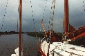 Mit einem Plattbodenschiff zu segeln, bringt ein bißchen mehr Arbeit mit sich. Bei der Wende muß das leewärtige Schwert just in dem Augenblick in Wasser fallen, wenn das Schiff gerade wieder Fahrt aufnimmt. Macht man dies zu spät, dann schwimmt das Schwert oben auf, und der Kahn treibt ab. Macht man dies zu früh, kann es passieren, dass das Schwert auf Grund fällt, eine 2 t schwere " Grundel " gegen das Schwert drückt, ... dann schwimmen die Reste des Schwertes hinterher, und der Kahn treibt ab. Ich spreche aus Erfahrung!