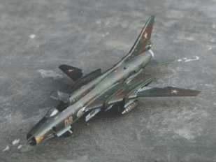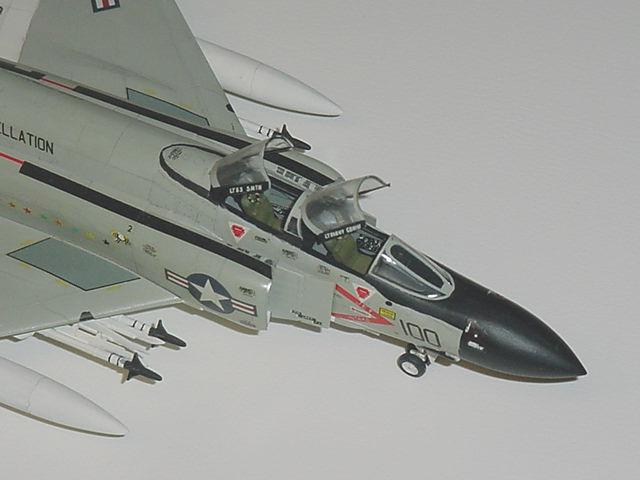 A fotón az amerikai Haditengerészeti Légierő F-4J Phantom-ja látható. A makett érdekessége, hogy egy vietnami ász-páros gépét ábrázolja. Rádió hívójele szerint: a "Showtime-100"-ast. Név szerint: Randy Cunningham és Willie Driscoll százados gépét. Ez a gép arról híres, hogy kettős légigyőzelmet ért el két vietnami MiG-17-es ellen. Egy későbbi bevetés során sajnos a gép megsemmisült - a személyzet szerencsésen katapultált -, de új gépet kaptak, amit ugyanilyenre festettek. A makett ezt a második változatot ábrázolja. A makett a Hasegawa gyártmánya, eredetileg F-4D volt, de átépítettem F-4J-re. A dobozban minden alkatrész megvolt hozzá, csak az orrkúp alatti kis "bigyót" készítettem házilag. Festése: felül FS16440 világos sirályszürke, alul fényes fehér.