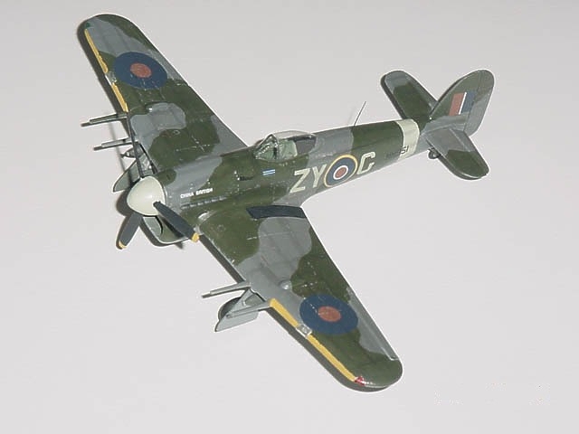 A Typhoon-t eredetileg elfogó vadásznak tervezték, ám annak nem vált be. Viszont kitűnően bevált alacsonytámadó feladatokra, végül is ebben a feladatkörben vetették be nagy számban. A korai tipusok még "gépkocsiajtó"-s kabinnal és háromágú légcsavarral készültek, később "buborékkabin"-t és négyágú légcsavart kaptak. A makett egy átmeneti tipus, buborékkabinnal, de még háromágú légcsavarral. Ez a makett az Airfix egyik korai gyártmánya, egyetlen erénye, hogy olcsón hozzá lehet jutni. :-) Én kihívást láttam benne és megvettem. Nem részletezem, mennyi munkát adott (csak címszavakban: kabinbelső, kabintető, futóakna, fékszárnyak), de ahogy mondani szokták: innen szép nyerni! Festése szabványos RAF festés: Ocean Grey, Dark Green, Medium Sea Grey. Az orrkúp és a gyűrű a törzsön Sky színű.