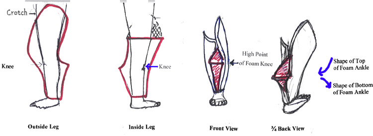 Essentially, the foamed leg pieces were used as the pattern for the shape of the muslin (& the actual fur), only, I added an extra 2" to allow for seam allowance and movement.
