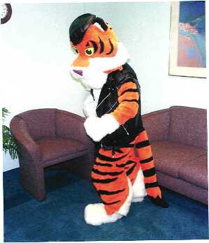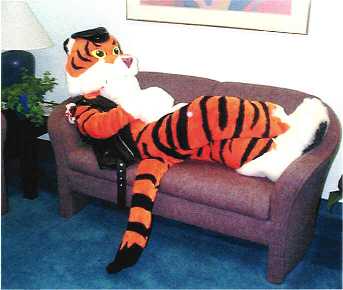 The tail was constructed around a 4" wide 3' long foam cylinder, which I happily discovered at a local foam supply. On the tail, I was able to machine stitch the stripes onto the orange fur, then stitched the tail casing inside out. After turning the tail rightside out, I then encased the foam tube and picked the fur from beneath the threads to hide the seams. On this suit, the tail is attached by hand stitching to the body suit. I will likely detach the tail & reattach to a belt worn under the suit, to save the seams from the tail tugging which will undoubtedly occur on more public appearances.