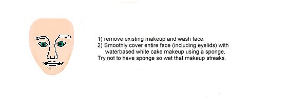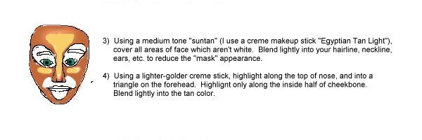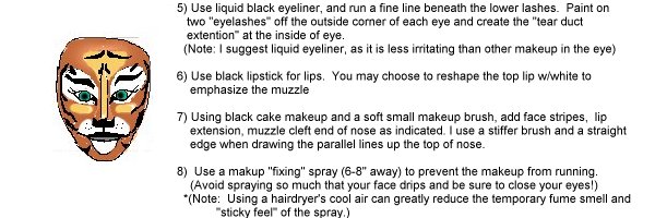 Well, here are the handrawn jpg's I have created on how I apply makeup for a tiger. I have done this style of makeup often enough that it generally takes less than 20 minutes from start to finish. The pictures are crude, but illustrative. I will touch these images up for better appearance soon. They do, however, demonstrate the basic idea in creating a reasonably believable tiger without using prosthetics. I will eventually have information up on my site regarding my experiences and advice regarding using prothetics to enhance your makeup creation.