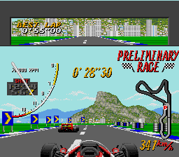 The arcade hit comes to the Genesis. You can choose between automatic, 4-speed and 7-speed manual transmissions. You can race in the Monaco Grand Prix, or you can participate in the world championship. There're 16 tracks, and the first six places get points for the championship. If you beat your rival twice in a row, then you get an invitation from your rival's team telling you they want you as their driver. There's a password feature. If you like driving games, this is a must have. For one player.