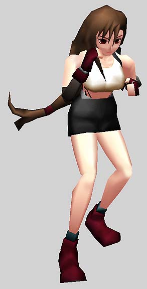 Tifa is a 20 year old Bar Hostess in the Sector 7 slums. She was trained in Martial Arts by a teacher named Zangan. She grew up in Nibelheim with Cloud and has strong feelings for him. Aside from being a Bar Hostess, she is one of the main people of the Resistance group, AVALANCHE. She also looks out after Barret's daughter, Marlene when Barret is out fighting Shinra.