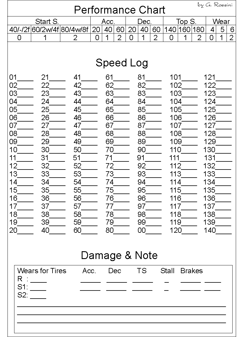 N.B. Le nuove schede di gioco prevedeno la Start Speed modificata secondo le regole ufficiali FISA con la riduzione per le piste a 6-8 giocatori (tipo Avalon Hill). Inoltre ho aggiunto la divisione dei wear per set di gomme. Per qualsiasi commento scrivetemi.
