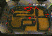 Possibly the most useful trick in the game is jumping back over the starting lane wall. Accomplishing this task is much more difficult than getting over the first time, as you must clear a higher vertical distance, and you usually will not have the aid of a boost. Basically, you want to aim your kart at the portion of the wall over which you can see the start/finish line pole, and you want to hit the wall as close to perpendicular as possible (therefore, all your momentum is directed to pushing your kart over, and not along, the barrier.)