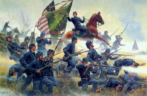 The march was over shortly. Within an hour, we had been placed just one mile from Confederate lines. Around us, the sounds of battle could be heard. A placement of artillery on our left lobbed shells at masses of rebel infantry. I heard the shell whistle toward their targets, then explode, sending dirt and grass and limbs into the air. My comrades and I watched a regiment of Federal infantry cut down in a desperate attempt to break rebel lines. Men died by the hundreds. In some places the musketry fire was so thick, entire companies were wiped out where they stood, the corpses still in perfect formation. I shuddered. Why had I decided to fight? Because I need to serve my country, I told myself. Again, my thoughts drifted to my family in New York. I missed them dearly.