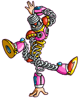 Spring Man was built a human-spring, which allows him to stretch most his body to long lengths, bounce at extreme heights, and fire his arms while in the air. He can charge his Wire Coils to the ground and let's them bounce off to his enemies. Spring Man feels at ease, and has no vague, whatsoever. He loves practicing running jumps, and hates low ceilings.