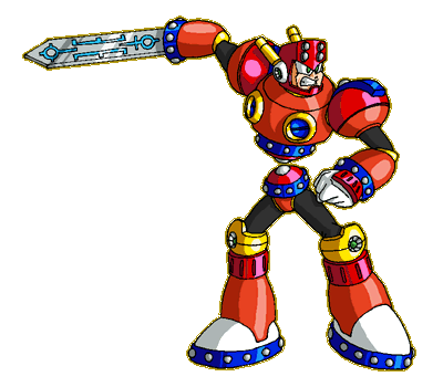 One of Wily's most prized thefts was an ancient sword he lifted out of a mueseum. But the sword was so huge he could not find a use for it. Finally he built Sword Man, but Sword Man could not balance the weight. Wily decided he must float Sword Man's upper body above the rest, so he will not be clumsy. The devastating sword can be charged up and shoot fire. The Water Balloon will cool this robot out...