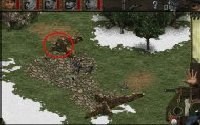 Your next move is a bit tricky. Have the Sniper and Driver crawl up to the rock outcropping, where they'll meet up with their buddy the Green Beret. From there, have the Green Beret crawl northward to the other outcropping of rock; have him plant his noise maker and then crawl back to cover behind the first rock outcropping.