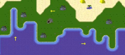 Tip #6 - this really bugs me for some reason, I just feel that if your going to go through all the trouble of making a map, why not give it an extra 5 or 10 minutes to fix it up, get rid of those cities that are half on land, and half on water, or other terrains, make sure the roads are all correct (this can be another tricky one) check to make sure your land transitions are all smooth. Do it before you submit your map, so you dont have to deal with it later. Here are some examples of some of the most common mistakes I took the time to mark the problems in little yellow arrows for you really slow people: