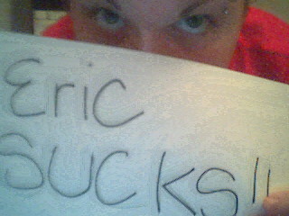Oh my god!! I found out that Eric's gonnabe working the Eagle Eye Cherry show on saturday. I'm so fucking excited now. I'm gonna keel over and die. I keep thinking "does he want me, or does he not want me?" Bleh. He was descrbing his ideal woman to me "About 5'11" or above, long thin legs, and an angular face..." That is NOT me!! I am short and stumpy and have a round face. Bleh!! But I took a picture with my holding a sign saying "Eric Sucks" and he made is his wallpaper on his computer. Isn't this a sign he wants me? I really think so. But he says no. Fine. I'll just have to show him my tits. :D