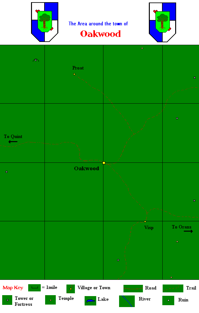 -----The area is dotted with yeomen farms, woodland homes, hills, lakes and ruins left behind from the Gorian and Lathanian Empires. In the fief of Oakwood are about 8 villages. The four villages closest to the town of Oakwood are Proat, Quint, Visp, and Orans.