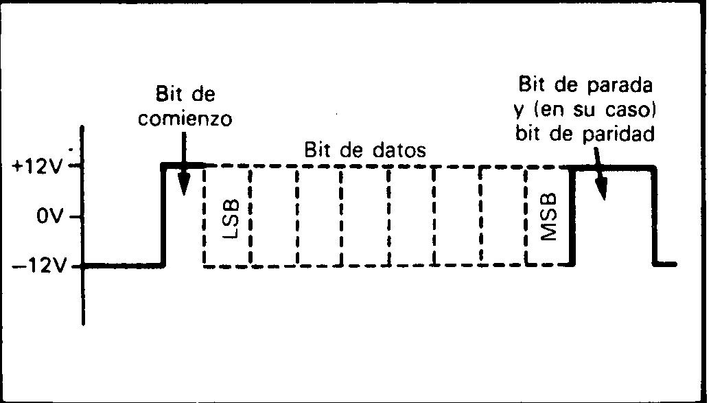 Probablemente sería posible realizar un sistema que incluyera señales de acoplamiento a través de la línea telefónica, a las señales de datos y acoplamiento multiplexadas en la misma línea por el transmisor y demultiplexada de nuevo en el equipo receptor. No conozco ningún sistema práctico de este tipo y, de todas formas, sería una complicación innecesaria. Las extremadamente lentas velocidades de transmisión utilizadas con los modems hacen que no sea difícil para el equipo receptor aceptar un flujo continuo de datos. Considérese la popular velocidad de transmisión de 300 baudios. Con 10 bits por byte (incluyendo el de parada y el de comienzo) se, logra una velocidad máxima de transferencia de 30 bytes por segundo. Excepto con ordenadores muy lentos, un software de terminal escrito en BASIC puede resultar suficiente y no es normalmente necesario recurrir al lenguaje máquina. Existe una ligera complicación en el sistema RS-232C que consiste en que hay dos tipos de equipos RS-232C, hay equipos terminales de datos (DTE) y equipos de comunicación de datos (DCE). Los equipos terminales de datos pueden ser considerados como el elemento central del sistema y, por tanto, recibe por la entrada de da- tos y transmite a través de la salida de datos.