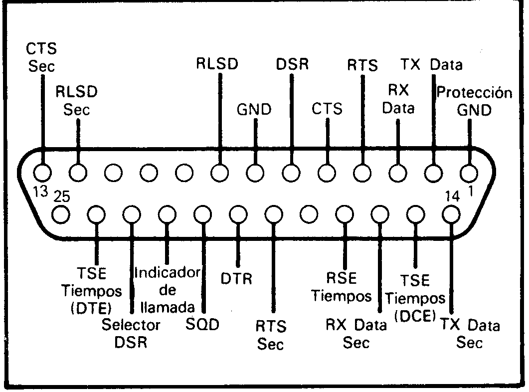 También es necesario que los datos se transmitan con el mismo formato, el número de bits de datos y de parada deben ser el mismo, igual que el tipo de paridad utilizada. De todas formas, a veces es posible recibir con un formato equivocado. Por ejemplo, dos bits de parada funcionarán igual que un bit de parada. No existe peligro de estropear el equipo utilizando formatos incorrectos, así que puede resultar interesante realizar pruebas. De todas formas, el número de bits de comienzo suele estar especificado (por ejemplo, el RS-232C y RS-423 siempre es un bit de comienzo). Cuando se utilicen modems es importante darse cuenta de que están diseñados para trabajar a una de- terminada velocidad de transmisión y que, por tanto, si se utiliza otra no se realizará correctamente una transmisión. No intente utilizar una velocidad de transmisión superior a la de las especificaciones de su módem, ya que, en el extraño caso de que funcione, no le proporcionará ninguna fiabilidad. La figura 2 proporciona los detalles de las conexiones del estándar RS-232C, pero hay que indicar que la mayoría de los ordenadores con interfaz serie no utilizan el conector estándar D-25 que se muestra en la figura 2.