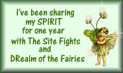 Now, are you asking yourself, "What is this Site Fights thing?" Well, I'll try to answer that for you. *S* It all began on October 4, 1999. That is the day I became a part of this 'Site Fights thing'. I found it to be an out-going place where people come to take part in a bit of friendly web site competition. At that time, my web site was only...oh, about 1/2 month old so I decided I should wait before I throw my site out there. I think that turned out to be an excellent idea. Because, I found DRealm of the Fairies. I read about the fairies and what they did for the fighters and just knew that this was something I could do! So, I joined a team called The Wandering Fairies. I cheer for fighters in every team, all over the realm. *S* It will absolutely fill you full of spirit! We 'dust and sprinkle' guestbooks and make sure the fighters site is still in compliance with The Site Fights rules...wish them much luck and then fly off on our merry lil way! =)