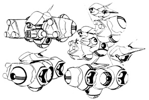 The Recon drone was more heavily armed than the regular Bioroids, as it would often have to operate alone. It was equipped with a forward-mounted Quad-Barreled laser cannon and two launcher for medium-range missiles. However, the unnit was not designed for combat, and the weapons were mainly for defensive purposes.