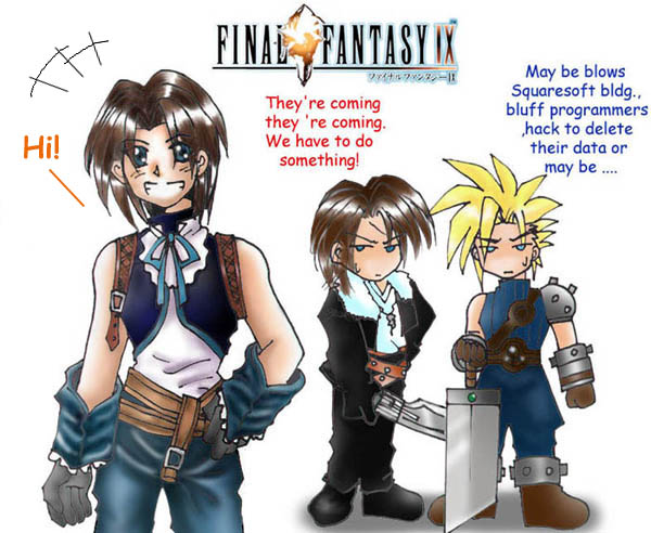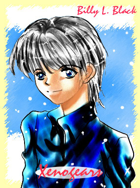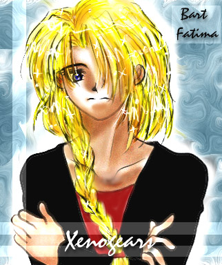~ My comment ~ FF9 : It's a picture of our new hero. I think his name is Zidane ( or Zidan , Zitan , stan or whatever...) I like his cloth. He seems to be lively person at least in my opinion. Well... after watching FF9 and Coke commercial I think my suggestion is true. He he ^_^ This pic was drew in paper then color in Photoshop 5.5. Billy from Xenogears: Our favourite priest who use guns. Draw and color in Art Dabbler, Background in Photoshop 5.5. Go go Billy!!! Bart from Xenogears : My adorable one. Draw and color in Art Dabbler, Background in Photoshop 5.5. [ back to main] [ ff7 ] [ ff8 ] [ GW ] [ gifts ]
