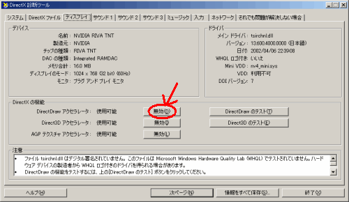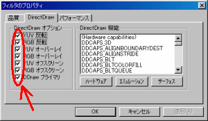 さらに出て来たフィルタプロパティのダイアログボックスの[DirectDraw]のタブを選び、[DirectDrawオプション]のチェックボックスを全てオフにして下さい。