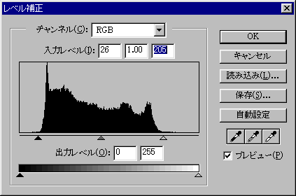 私がこの処理に使ったのは Painter という描画ソフトの「イコライズ(Equalize)」という機能ですが、Photoshopの場合は、「レベル補正」という操作で同様の処理が出来ます。(下図)