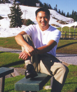 Michael is showing off the new shoes he bought in Vancouver. This picture was taken in July 1999 on top of Grouse Mountain, Vancouver.