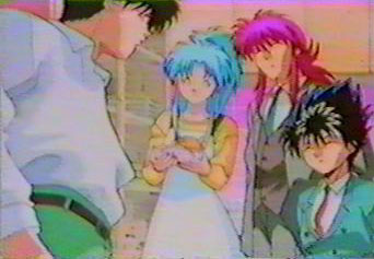 | From one of the Eizou Hakusho omakes. Supposedly, Yusuke and Botan are a married (?) couple (Yusuke had a dream), but when Kurama steps beside her, it looks like a wholly different story. ^.~ |