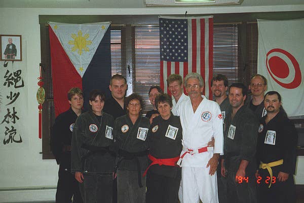 | Truly have to tell this one story for the web site. The third young lady to my right is Mary san. She received her Black Belt a week or too prior to my visit. Mary also made the adventure to California almost going on two years ago. During a trunk twist exercise I am standing behind seito working out. It seems there were maybe 8 or 10 more seito in class. Mary is a soft spoken, beautiful heart individual. Her boy friend is standing over her left shoulder. He is at least 275 easy! I just place my forarms in position for their arms to strike during exercise. End of class I even complimented her infront of all. That she truly hurt my arms more than anyone else in class that day. She is truly learning the ki concepts I have presented. Then again it is her effort, that makes her rewards, and credit. |