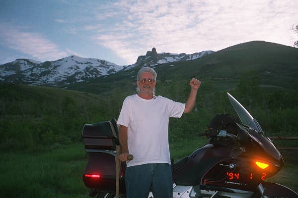 | This beautiful mountain range, around Angel Lake area. Good refreashing place to camp after ride in warm sun. Got gas at bottom of mountain, and a cold cut sandwich, and couple cokes, and water. Glad I had, for I got hungry. After fighting a little while got my tent up, a little wind can slow things down with only one putting tent together. Sleeped pretty good that night considering my back and arms were killing me. Didn't want to convey negative items along journey, but what is, is! There were several camps around the area. The next morning I video my leaving the site, and woow like a good guy wanted to drop my garbage off, almost dropped my bike loaded down. I could never put bike on its center stand. Just no pull power. |