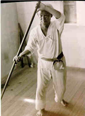 | Hohan Soken Shinshii, sitting and observing class. This is the window in which he entered dojo. He utilized this window several times during class. Only 1 time in a year and 1/4, while going into home. Soken's right foot was upon window ceil, and left foot into bedroom. His right foot slipped down towards dojo floor. Soken's gi pants, didn't even touch the windo ceil. His ability at 83 was astonishing. This is what helped Charles Shinshii, to continue the martial arts. | |||||||||||||||||||||||||||