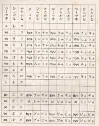 As colunas estão na seguinte ordem: alfabeto romano, hiragana e katakana. Clique para aumentar a imagem.