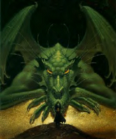 Looking up into the shiny, intelligent eyes of the green dragon froze the very breath in his chest. The massive green head resting on two powerful limbs of a radiant green, the scales and flesh seeming to dance in the light suddenly provided. The rippling, coursing hide of the dragon did nothing to detract from the power playing in the muscles of the great beast. An enormous pile of material wealth lay under the arms and head of the adult green dragon, his horde. Goblets, coins, gems, jewelry enough to put all the families to shame. And the sheer power of the creature resting on his prizes.