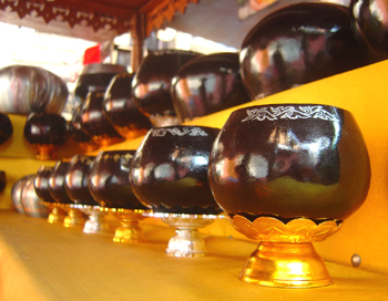 บาตรพระตั้งวางอยู่ แต่เป็นที่น่าเสียดายว่าในระยะหลังนี้ การทำบาตรพระในชุมชนได้ลดน้อย