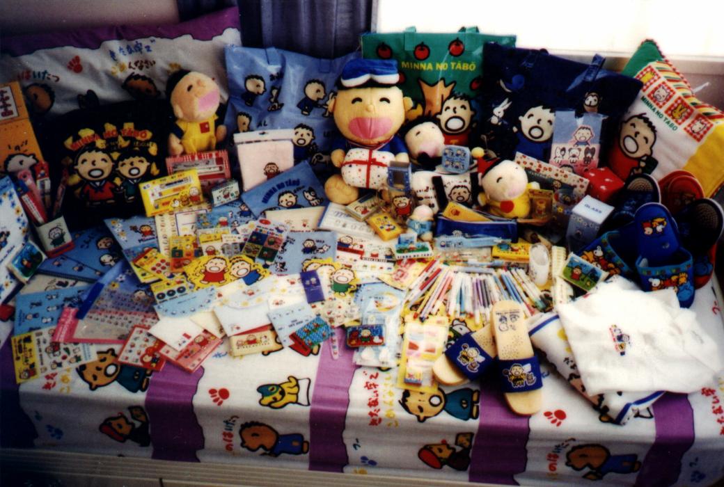 | 呢張係我o向94年所拍下既大口 仔收藏大合照,當中當然有我最 喜愛既物件喇! < 有tabo日本木屐...............(右下角) 有tabo狗仔型書籤...........(右上角) 有tabo微型文具兩set'約3吋(左中) 有tabo3D雷射貼紙..........(左下角) 有tabo軟綿綿公仔...............(上中) 當然唔少得我第一件tabo珍藏喇!