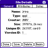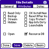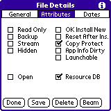 *注意* コピー禁止のアプリケーションや、Creator IDが同じデータベースが存在しないアプリケーションは Bundlerのアプリケーションリストには表示されません。上記の Jナビの場合には、次のようにコピー禁止の属性を外す必要があります。以下は Filezというツールを利用しています。Jナビは、Filezでは Jrtraという名前で表示されますので選択して Detailボタンを押して Attributesタグから Copy Protectのチェックボックスを外して Saveボタンを押して設定します。