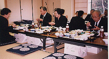Shijuku-nichiLike the osoushiki, the shijuku-nichi was held at the Haatohoru Sentaa (Heartful Centre), a sai-jo recently built on the outskirts of town. Both ceremonies are traditionally held in the home of the deceased, but most modern Japanese houses and apartments are nowhere near large enough to accomodate all of the people attending. This is a source of stress for some facing the task of making funeral arrangements, like the tearful manshon (apartment complex) neighbour in the film Kazoku Gehmu (Family Game). A sai-jo offers the convenience of ample parking, spacious banquet rooms, on-site catering and helpful staff. Given the rapidly aging Japanese population, the sai-jo business should be very profitable in the coming years.