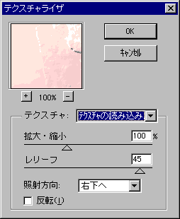 フィルタ「テクスチャライザを選び、テクスチャを「テクスチャの読み込み」で先ほど作ったグレースケール画像を使用します。
