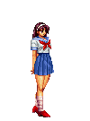 Athena é a personagem que mais mudou seu uniforme durante a série KOF, tudo jogada de marketing da SNK. Desculpe Aerith, mas não dá pra deixar de colocar aqui: clique em cima de Athena com o uniforme escolar pra ver o GIF animado de sua abertura em 98, que é onde ela mostra todos os seus uniformes até agora. Na ordem: o tradicional uniforme escolar, a roupa de 94/95, a roupitcha de 96 (a mais legal de todas! A saia é minúscula!), a roupa de 97 e finalmente, a de 98. Agora também está disponível a sua transformação de KOF 99. A primeira figura é a roupa que ela usa em seus shows.