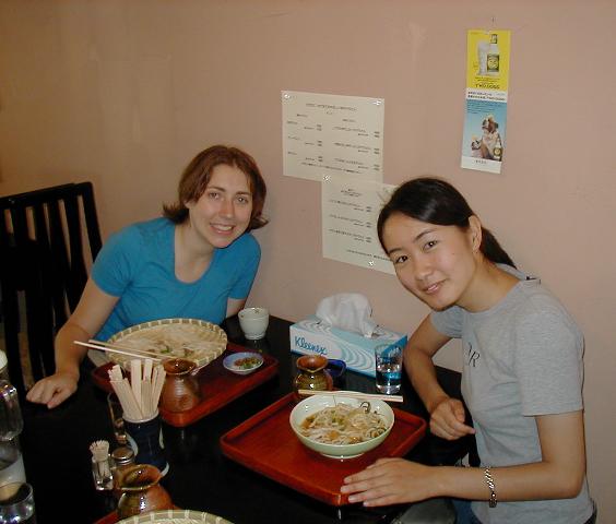 | Kana and Cary started laughing at the kanji. I am not too quick on this stuff so I asked what was so funny. Cary asked me if I knew the meaning of shiri, which how could I not (it refers to a person's "butt"). But I figured, that being a stupid name for a town or trainstop, "water bottom" or "butt water" would have to be an incorrect translation. After all, many kanji have several different meanings. Nope. We were at Butt-Water Beach. The name itself provided minutes of entertainment. Who would name something Butt-Water?? We walked up and down the highway that seperated the trainstop (no station, just the platform and a ticket vending machine) and the beach. There were factories as far as the eye could see, and we walked for about ten minutes or so. But finally we came upon an udon-ya and had some noodles. The sweet auntie that made our udon told us the secret of slurping. Foreigners do not generally expect there to be any meaning behind the slurping noise that asians do not mask when eating any noodley food. But there is. Someone once explained in a movie that it was "polite." Why would slurping be polite? What meaning does it have? A very logical one actually. The auntie at the udon-ya told us. A noodle-vendor will know right away when someone likes there noodles (excluding foreigners). By the slurping sound. Rather than trying to be quiet about eating, as is commonpractice in the west, the slurping noise indicates they like the taste. Why? You grab the noodles with the chopsticks and the sauce or broth will run down the noodles back into the bowl, leaving you only a fraction of the taste. You eat the noodles, with a little bit of flavor, the rest of the flavor ends up in the bowl which you could drink afterwards, but then the flavor isnt combined with the noodles. By slurping you get more of the flavor with the noodles. Therefore, slurping would tell a vendor you like the taste. 以上 | ![]() |