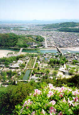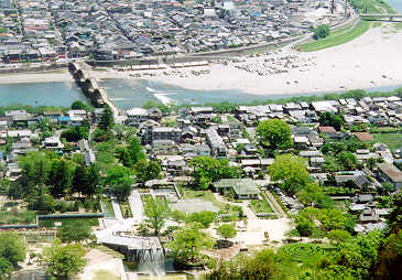 | View of Iwakuni from the top of Mt. Shiroyama. Kikko Park, the Kintai Bridge, the Nishiki River, and Iwakuni City can be seen. A beautiful (unusual) clear day! 5/98 |