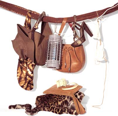 Their kimono-inspired wrap dresses, created from laser-cut fabric, allow for roominess and sexiness. A green long-sleeved dress, wrapped at the waist, tightly envelops the body, stopping asymmetrically around the knee. A wide-rose tube top cinches a bias-cut gabardine sleeveless dress. Matching pouches, attached in back, accentuate the elaborate waist wraps.