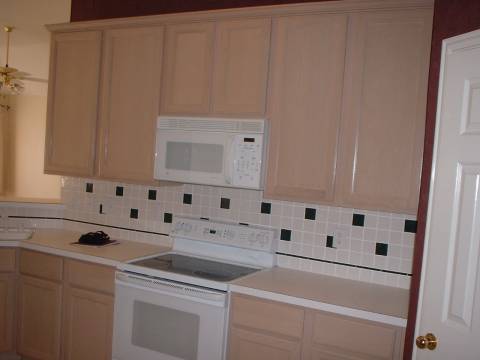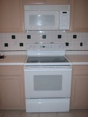 Kitchen: Microwave, Electric Range, and Cabinets (Door to Pantry on Right)