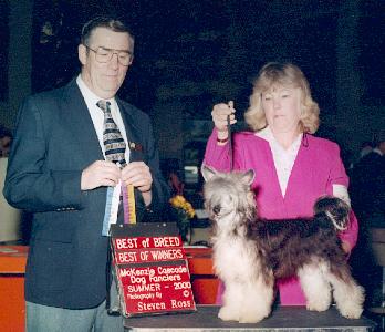| aka Widget ** a black, tan &white tri powderpuff Chinese Crested Sire: Am/Int. Ch. Makara's Rico Suave, SOM - out of - Dam: Ch. Snowcrest Gabriele at Reimar |